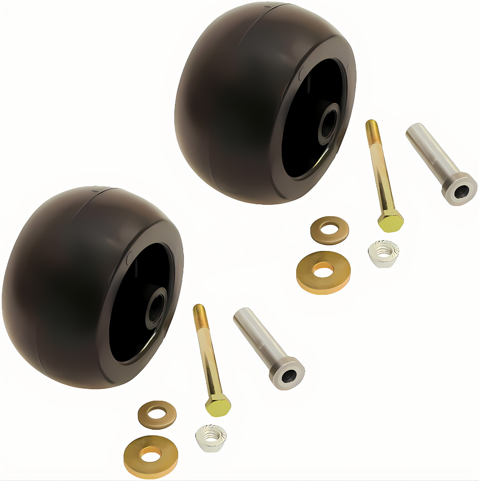 The deck wheel/roller kit includes bushings, bolt, and washers.
