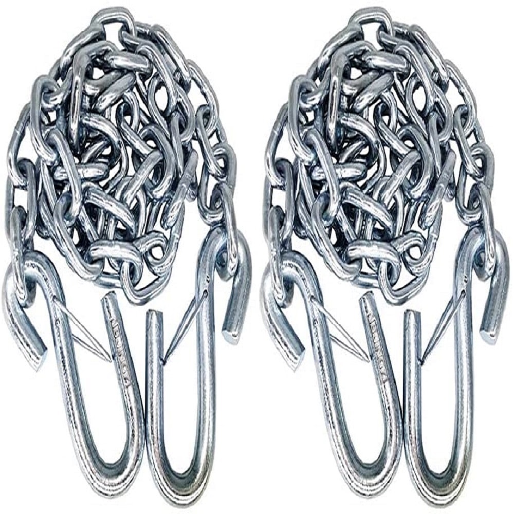 This 1BJY-SC-02A-TWO 1 4" X 48" 2PCS Grade 30 Trailer Boat Gooseneck Safety Chain with Spring Clips with 2pcs S Hook is made of high-quality zinc plated alloy steel to prevent rust. It comes with 2 x S hooks with safety latches for secure attachment. The length of the chain is 48 inches, providing ample length for various towing needs.