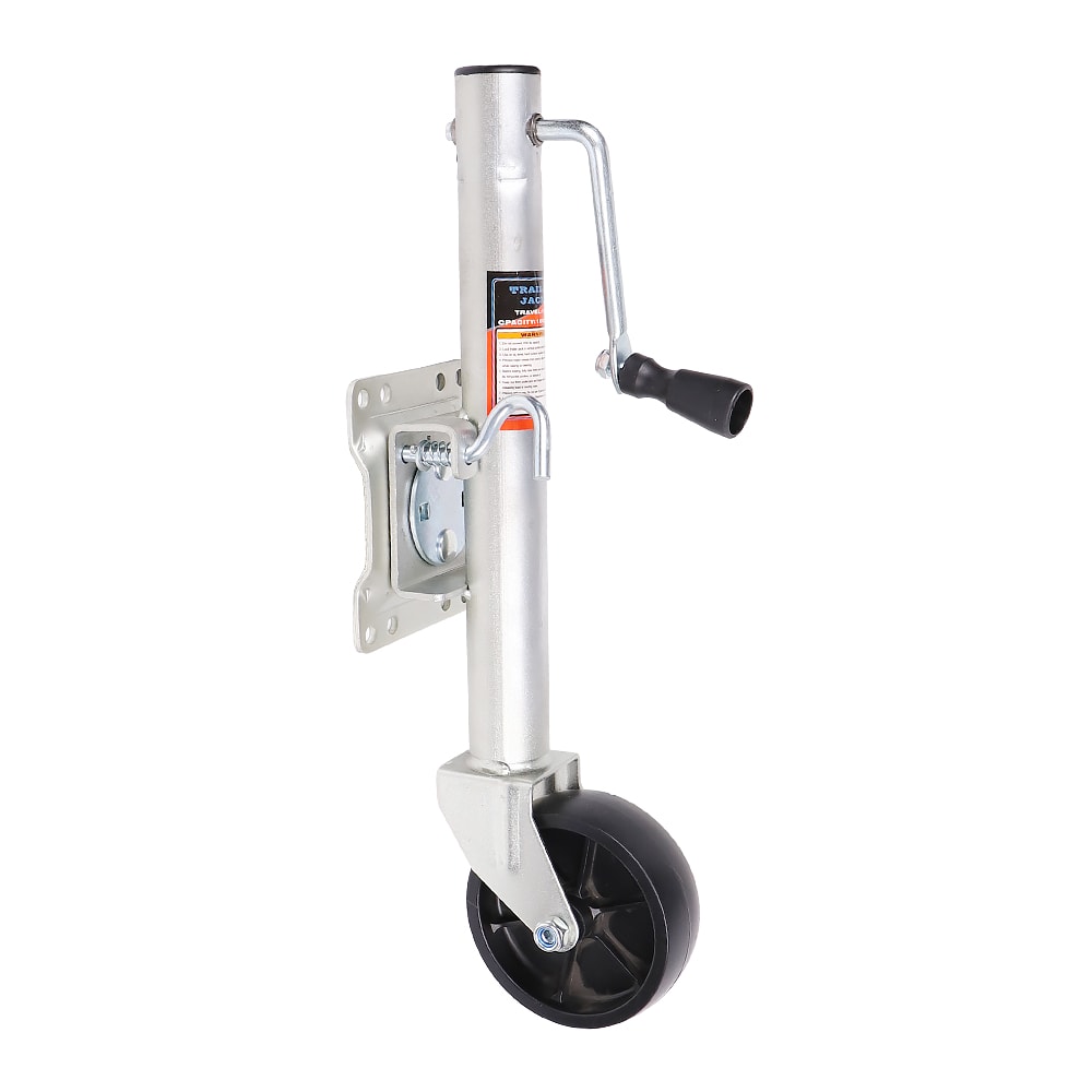 The 1BJY-TJ-03 Swivel Marine Tongue Jack with Wheel - 1000LBS Capacity is a heavy duty tongue jack designed for marine trailer use. Constructed of heavy duty steel, it features a caster wheel for easy mobility and comes with mounting hardware. The E-Z grip side crank rotating handle makes operation a breeze.