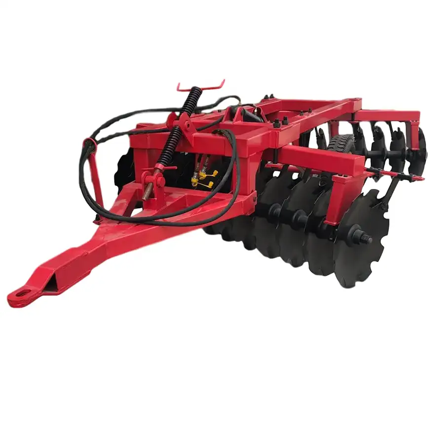 The 1BZ trailed type heavy duty offset disc harrow is a robust and reliable piece of machinery designed to boost productivity in the farming sector. Its primary function is to loosen the soil, making it an invaluable tool for farmers and those in the agricultural industry. The machine's core is made up of bearings that are durable and designed to withstand heavy-duty operations.