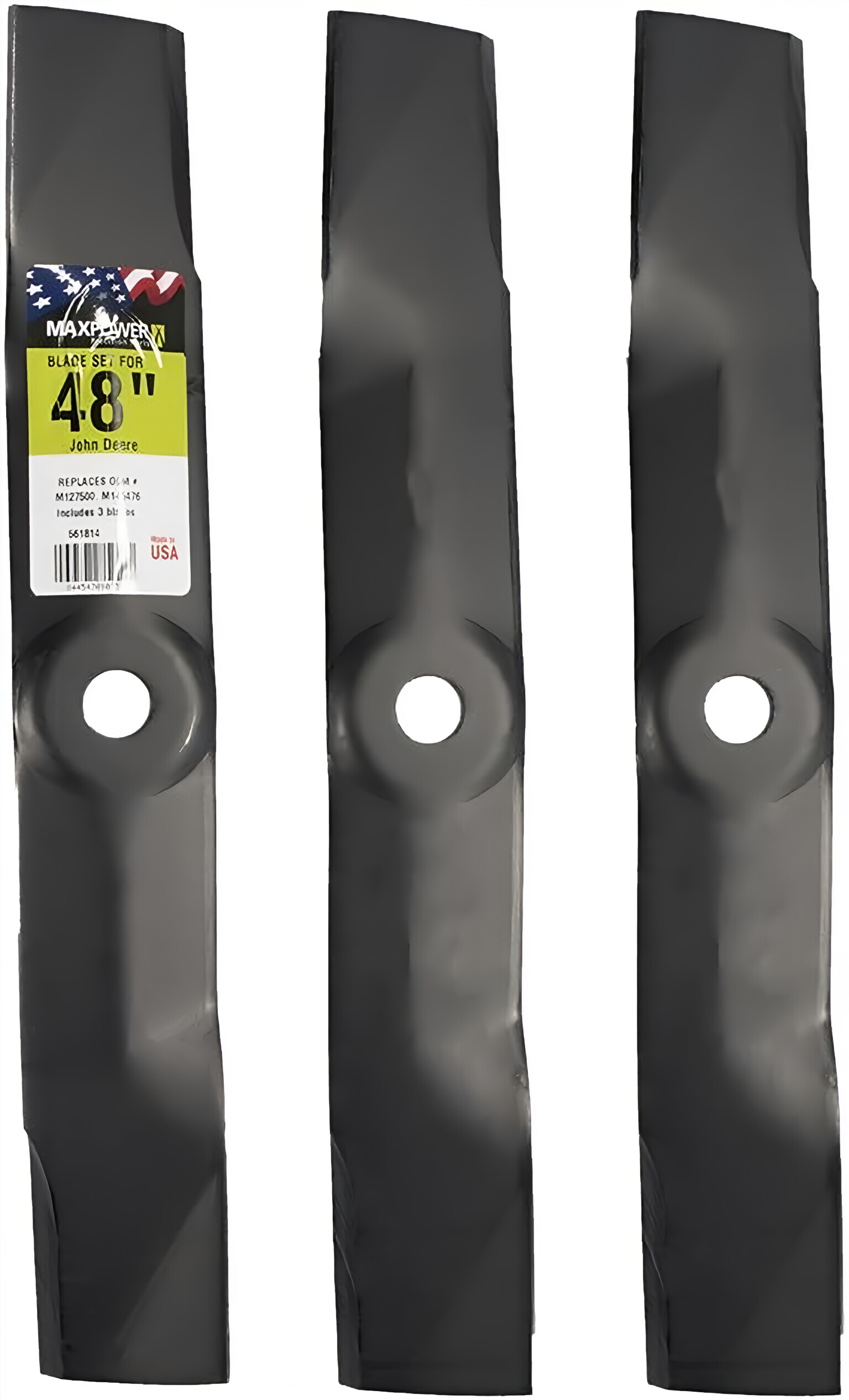 The MaxPower 3 Blade Set for Many 48 in. Cut John Deere Mowers is a top-quality replacement blade set designed to replace OEM#'s M127500 and M145476. Each blade measures 17 in. L and 2-1/2 in. W with a 0.80 in. center hole diameter. MaxPower blades are manufactured to meet or exceed all OEM specifications. The blades are sharpened during the manufacturing process and coated with powder for added protection. This coating will come off during the first cut to reveal a precision sharpened blade.