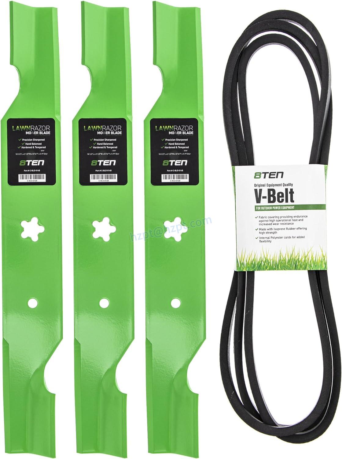 The 8TEN Deck Blade Belt Kit is designed to replace OEM parts for various 54-inch lawn tractors, including Ariens, AYP, Husqvarna, Poulan, and Jonsered. This kit includes a blade and a belt. The blade is a high lift type with a length of 18.5 inches, a width of 2.5 inches, and a thickness of 0.1875 inches. The center hole size is 5-point star, and the center hole offset is 3. The belt has a length of 147.5 inches and a width of 0.625 inches, and is made of NR rubber, polyester cord, and Type 1 fabric.