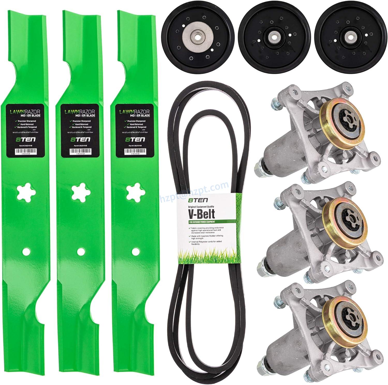 A: The kit includes 3 LawnRazor Blades, 3 8TEN Spindle Assembly, 1 8TEN Deck Belt, 1 8TEN Idler Pulley, and 2 8TEN Idler Pulleys.