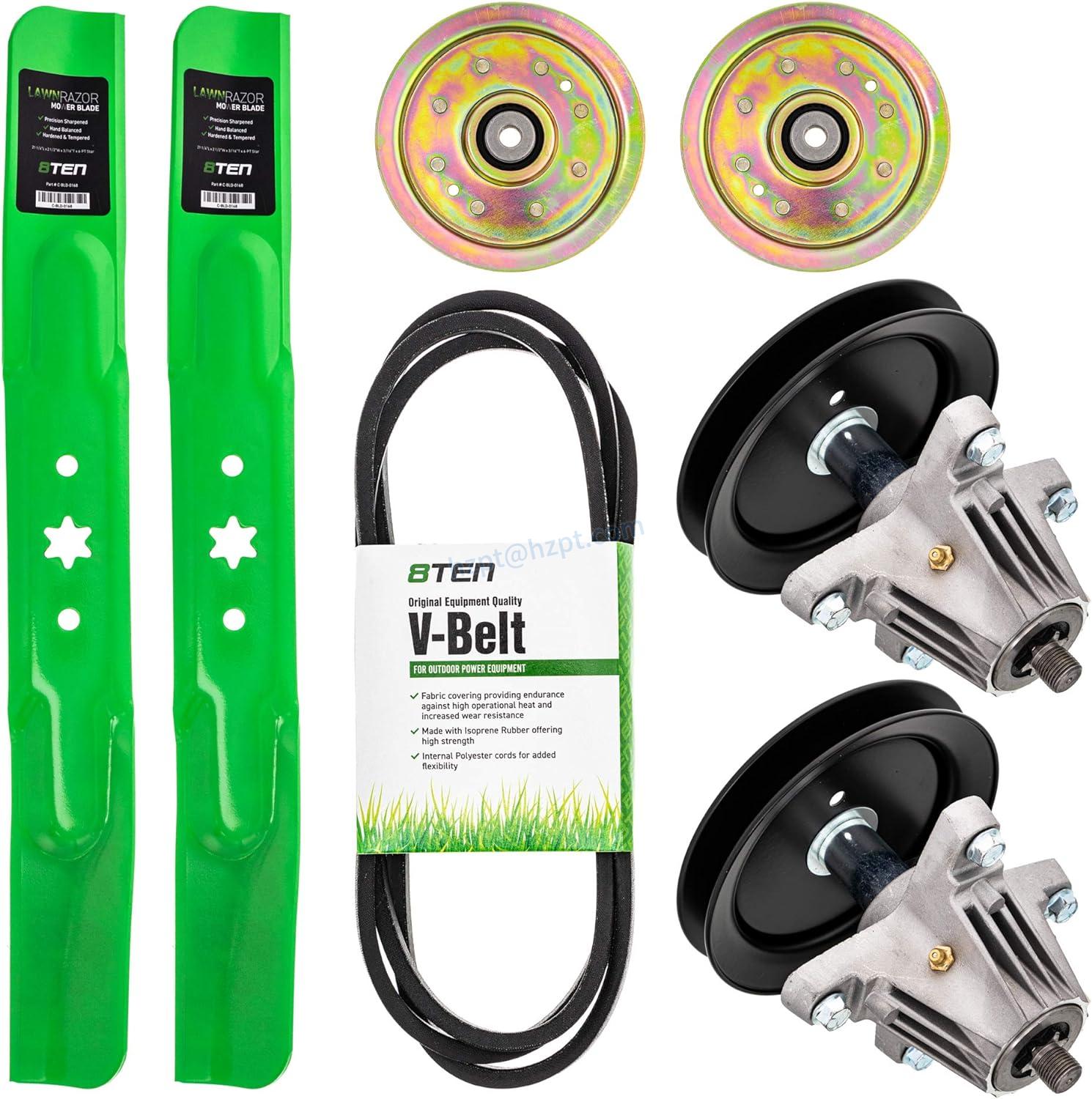 The 8TEN Deck Rebuild Kit is constructed from high-quality materials, including durable metals and tough plastics. Each part is designed to withstand the rigors of lawn mowing and is built to last. The blades are made from high-quality steel and are designed to stay sharp and resist wear and tear. The spindles are made from tough plastic and are designed to withstand the shock of mowing over rough terrain. The idlers are also made from durable plastics and are designed to keep the belt in place, even during heavy use.