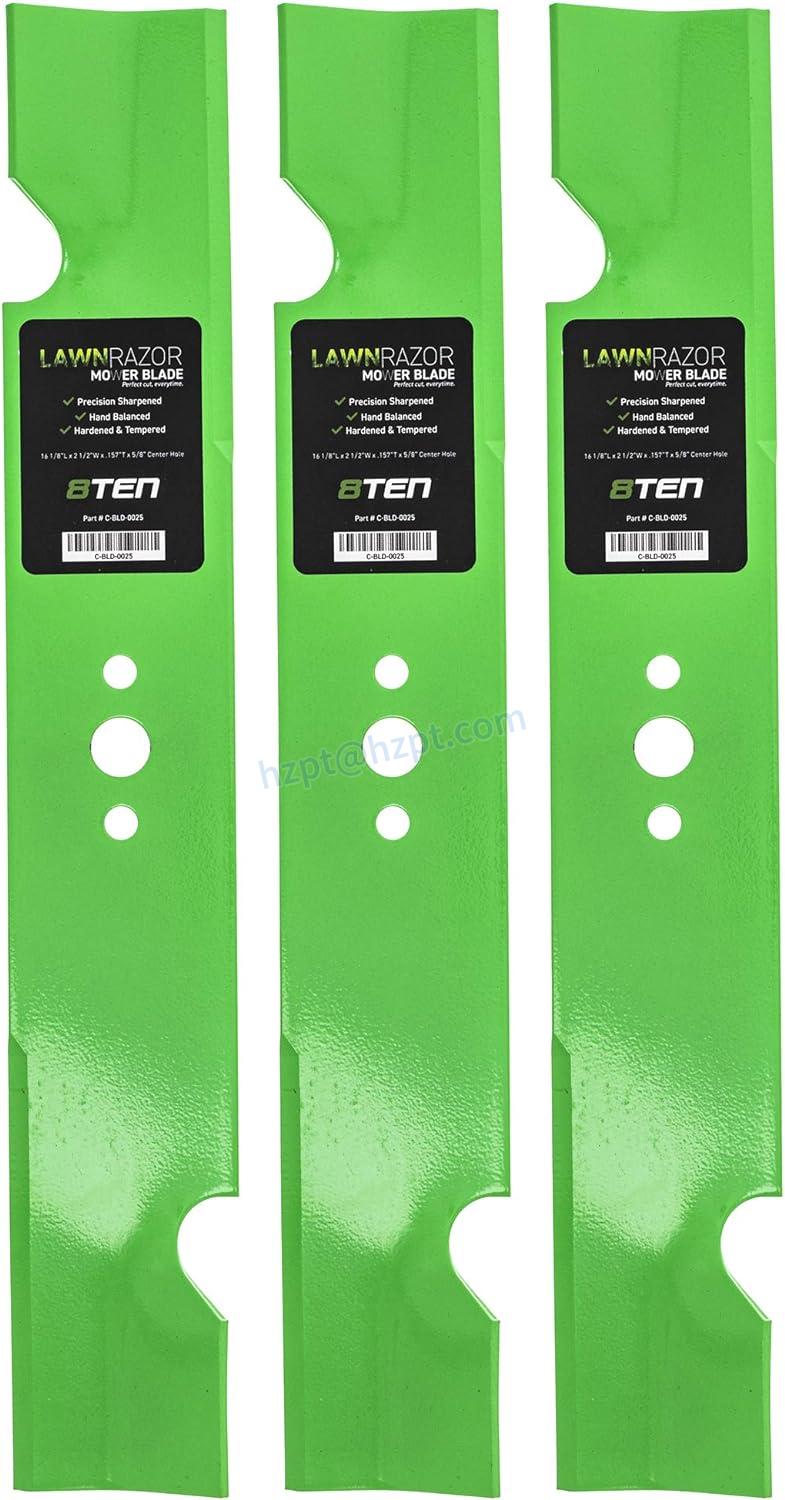 The 8TEN LawnRAZOR Mower Blade is compatible with a wide range of lawn mowers, including Exmark Lazer Z HP, Lazer Z CT, Metro Five Speed, Metro HP, Turf Tracer HP, Viking 5-Speed, Viking Hydro, Standard Five Speed, and Variable Five Speed with 32" & 48" Decks, as well as other popular lawn mowers.
