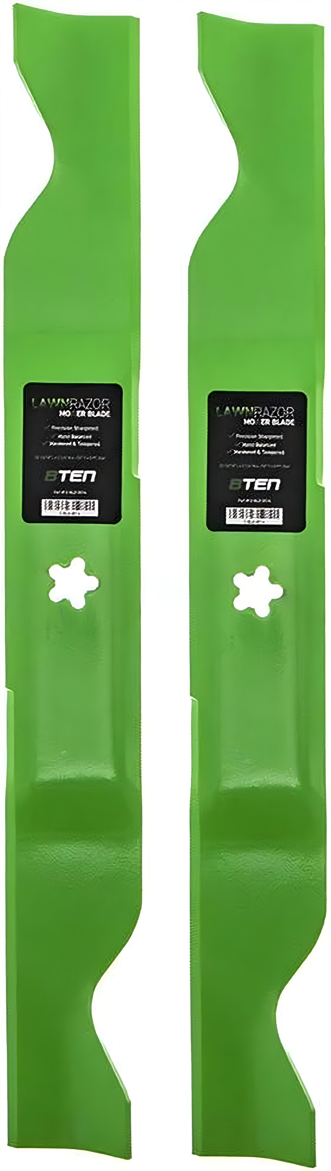 A2. The 8TEN LawnRAZOR Mower Blade Set has a length of 22 13/16 inches, a center hole of 5pt Star, a thickness of 0.157 inches, and a width of 2 3/4 inches.