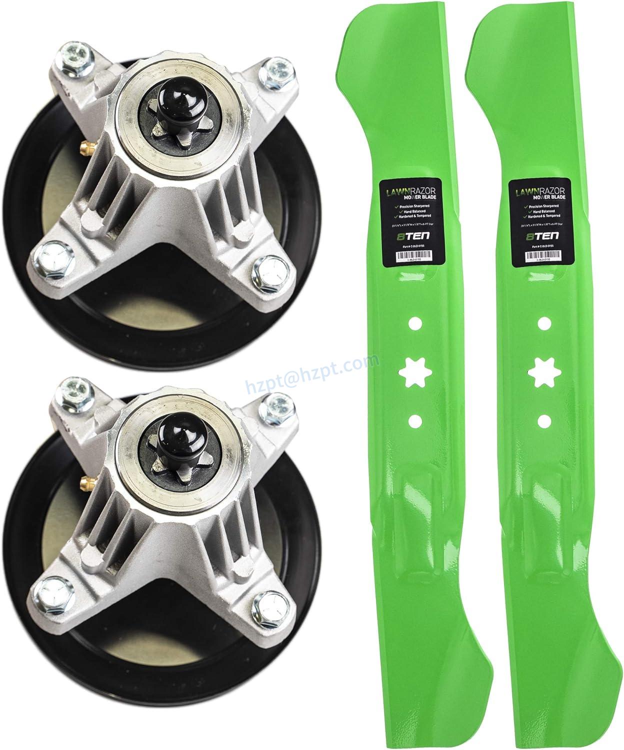The 8TEN Spindle High Lift Blade Kit includes two LawnRazor High Lift Blades 810-CBL2377D and two 8TEN Spindle Assembly 810-CSP2275N.