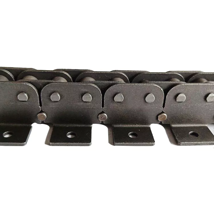 The Type of Plate Conveying ChainThe utility model discloses a conveyor chain which is connected by a number of external single sections and internal single sections. The outer single section includes the outer bending attachment plate A, the outer bending attachment plate B, the outer attached plate and the pin shaft, and the inner single section includes the inner bending attached plate A, the inner bending attachment plate B, the inner direct attached plate, the pin shaft, the sleeve and the roller. It has high loading capacity, rigid support and flexible turning, and is stable and synchronous.| Chain No. | Pitch | Roller diameter | Width between inner plates | Pin size | Plate thickness | Plate size | CL size | ||||||||||