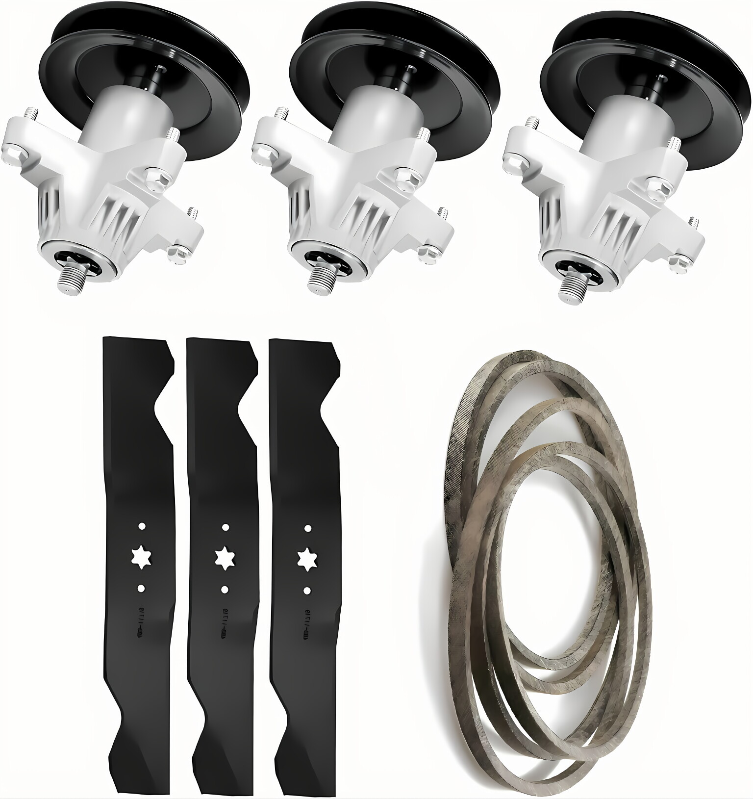 The kit includes three spindles, three blades, and one 148'' belt.