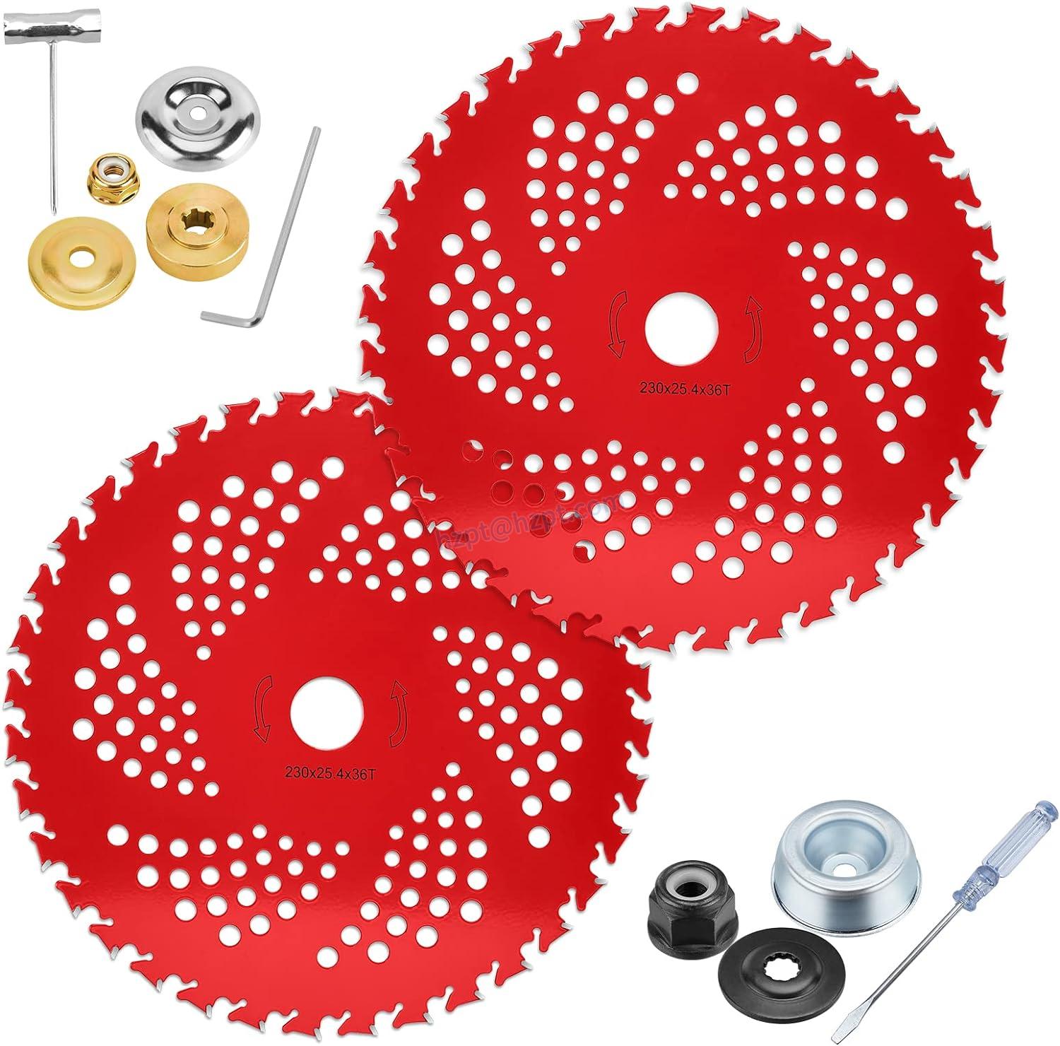 The HK 2 Pack 9" x36T Carbide Tip Brush Cutter Blades are ideal for your garden or agricultural needs. Made of high-quality carbide tipped material, the blades are durable and tough. These blades come with a carbide blade adapter kit that contains two sets of 9 pieces to mount on the weed eater. The package includes 2 x 9" 36 Teeth Carbide Tipped Blades, 1 x Thrust Washer, 1 x Rider Plate, 1 x Collar Nut, 1 x Screwdriver, 1 x Trimmer Head Cover, 1 x Fixed Plate (Down) Hexagonal Contour, 1 x Fixed Plate (Up), 1 x Trimmer Locknut, and 1 x Wrench.
