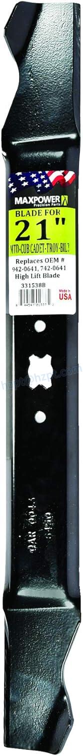 MaxPower's 331538B high lift mower blade is a top-quality replacement for many 21-inch cut MTD, Cub Cadet, and Troy-Bilt walk-behind mowers. This blade replaces OEM number 942-0641 and measures 21 inches in length and 2-1/4 inches in width with a bow-tie center hole pattern. It's perfect for ensuring a clean cut and a healthy lawn.