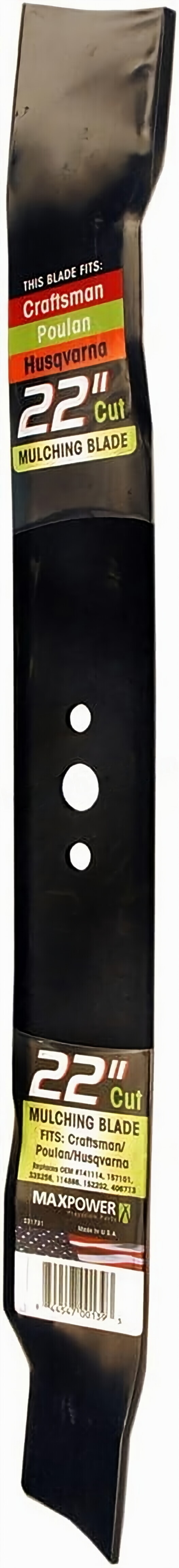 The Maxpower 331731B Mulching Blade is a high-quality replacement blade for many 22-inch cut Craftsman, Husqvarna, and Poulan mowers. This blade is made in the USA and is manufactured to meet or exceed all OEM specifications.