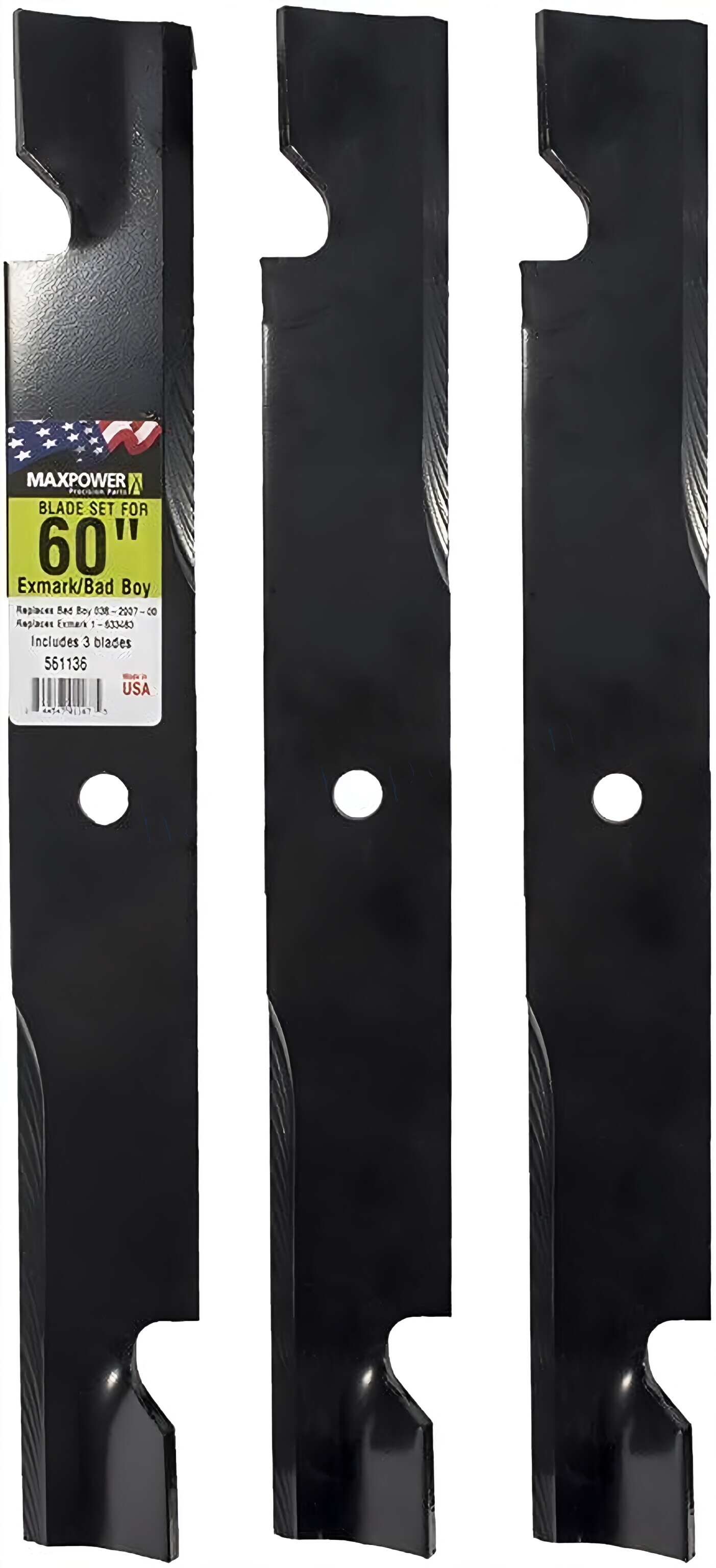 The MaxPower 561136B blade set is designed for use with many 60 in. cut Exmark, Bad Boy, Toro, Dixie Chopper, and Windsor mowers. It replaces OEM #s 633483, Bad Boy 038-2007-00, Toro 105771803, Dixie Chopper 30227-60, 30227-60V, Exmark 633483, Windsor 50-2814, and 50-2840. This blade set also fits some models of Ariens, Dixon, Gravely, and Hustler.