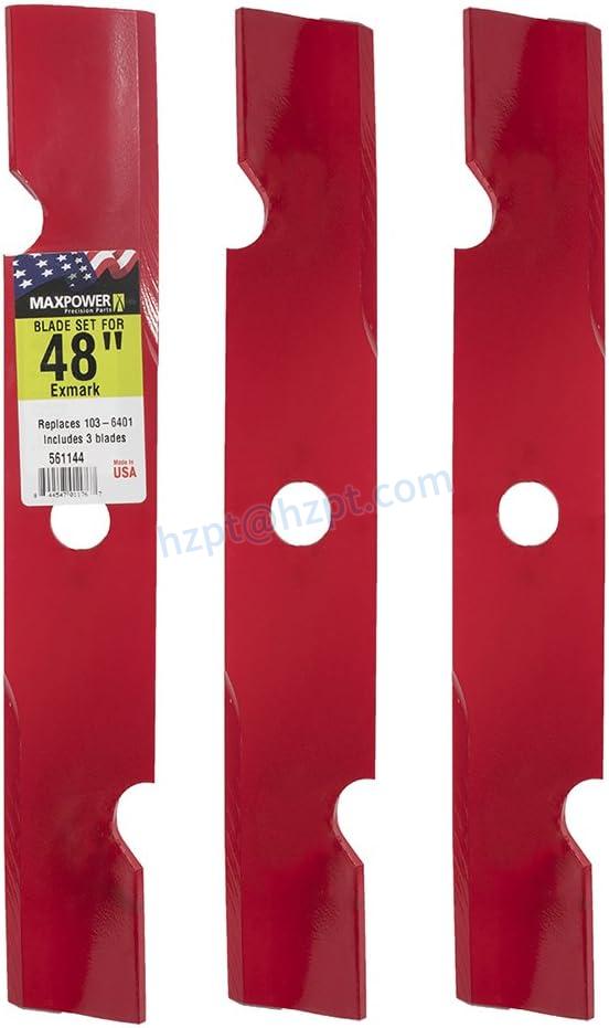 MaxPower's 561144B high lift blade set is designed for many 48-inch cut Exmark mowers. These blades are manufactured to meet or exceed OEM specifications and are proudly made in the USA. The following are the product specifications: