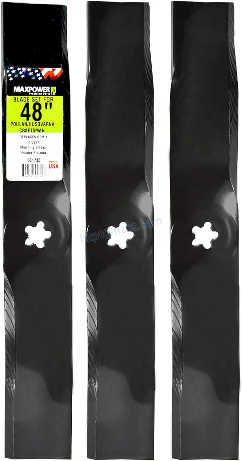The MaxPower 561736B 3-Blade Mulching Set is designed for use with 48-inch cut Craftsman, Husqvarna, and Poulan mowers. The set includes three mulching blades that replace OEM #532173921. Each blade measures 16-5/8 inches long and 2-1/2 inches wide, with a 5-point star center hole. These blades are manufactured to meet or exceed OEM specifications and are proudly made in the USA.
