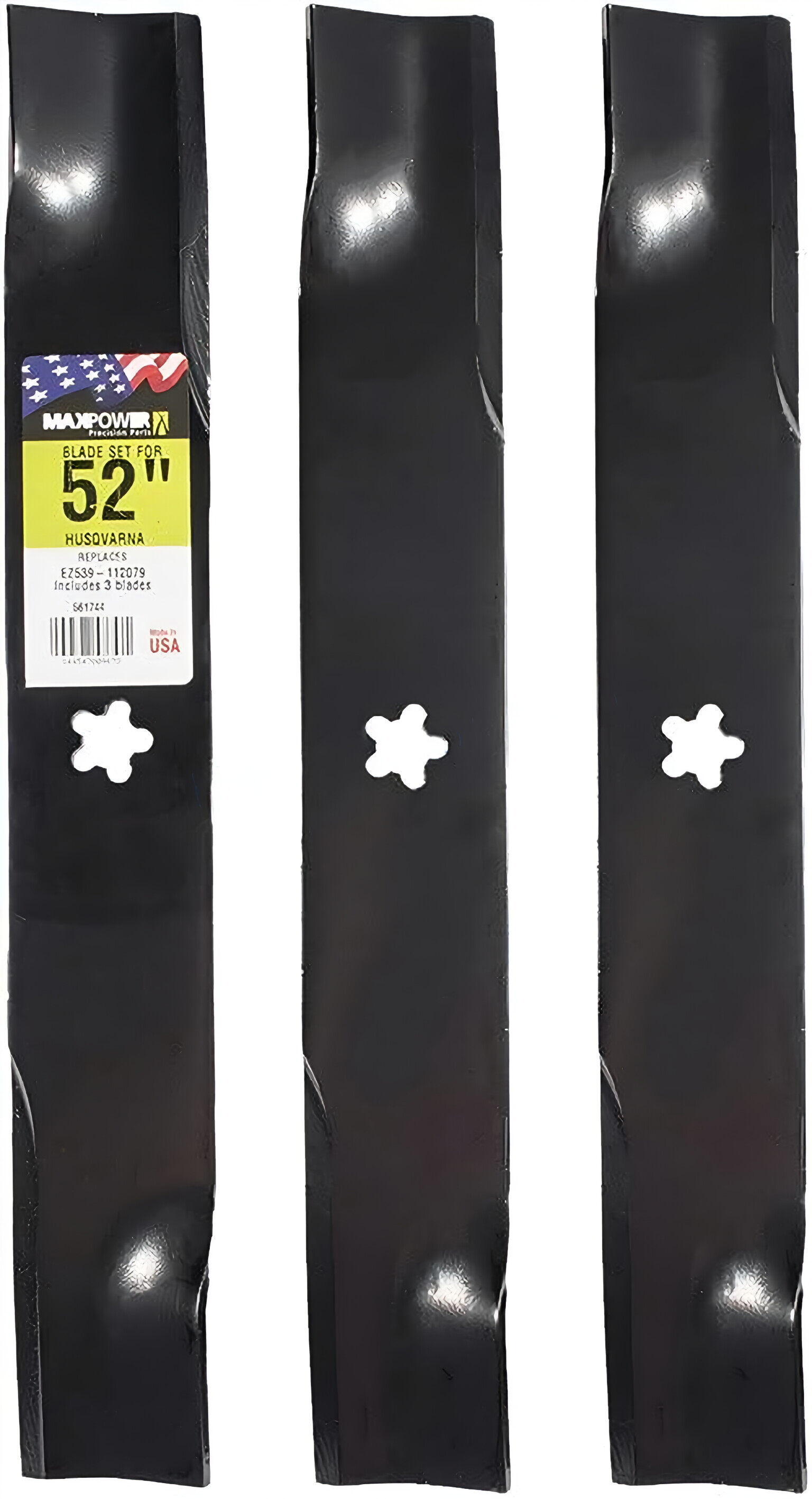 The MaxPower 561744B 3-Blade Set is a high-quality replacement for the 52-inch cut Craftsman, Husqvarna, and Poulan mowers. Each blade measures 18 inches in length and 2-1/2 inches in width, with a 5 point star center hole pattern. The set replaces OEM 539-112079 and is manufactured to meet or exceed OEM specifications.
