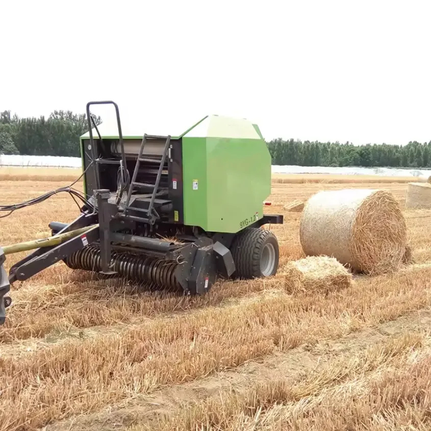 A tractor-mounted large round baler is a machine that is attached to a tractor and operated using the tractor's PTO. It is the agricultural equipment used to compress cut crops, such as hay, straw, or silage, into compact, large round bales that are easy to handle, transport, and store. Here's a step-by-step overview of how it works:1. Attachment to the Tractor: The large round baler is connected to the tractor using a three-point hitch or a drawbar hitch. The hitch ensures a secure connection between the baler and the tractor, allowing them to work together.2. Collection of Hay: The baler is equipped with a pickup mechanism, usually located at the front or side of the machine. The pickup mechanism consists of rotating tines or augers that gather the loose hay from the ground and feed it into the baling chamber. The pickup width can vary depending on the model.3. Feeding into the Baling Chamber: As the pickup mechanism collects the hay, it transfers it to the baling chamber. The hay is guided into the chamber, where it starts to accumulate.4. Bale Formation: Inside the baling chamber, the baler has belts or rollers that rotate, compacting the hay and forming it into a cylindrical bale. The pressure exerted by the belts or rollers creates a tightly packed bale.5. Bale Size Adjustment: Most large round balers allow for the adjustment of bale size. This can be done by changing the settings on the baler, which control the length and density of the bale. The operator can set the desired bale size based on their specific requirements.6. Bale Wrapping: Once the bale reaches the desired size, the baler applies twine or net wrap around the bale to secure it. Twine or net wrap is fed into the baler and is automatically wrapped around the bale as it rotates within the baling chamber. This ensures that the bale remains intact and prevents it from unraveling.7. Bale Ejection: Once the bale is wrapped, it is ready to be ejected from the baling chamber. The baler either drops the bale onto the ground, where it can be manually handled, or it may have a built-in bale ramp that allows for controlled unloading directly onto a bale wagon or trailer.