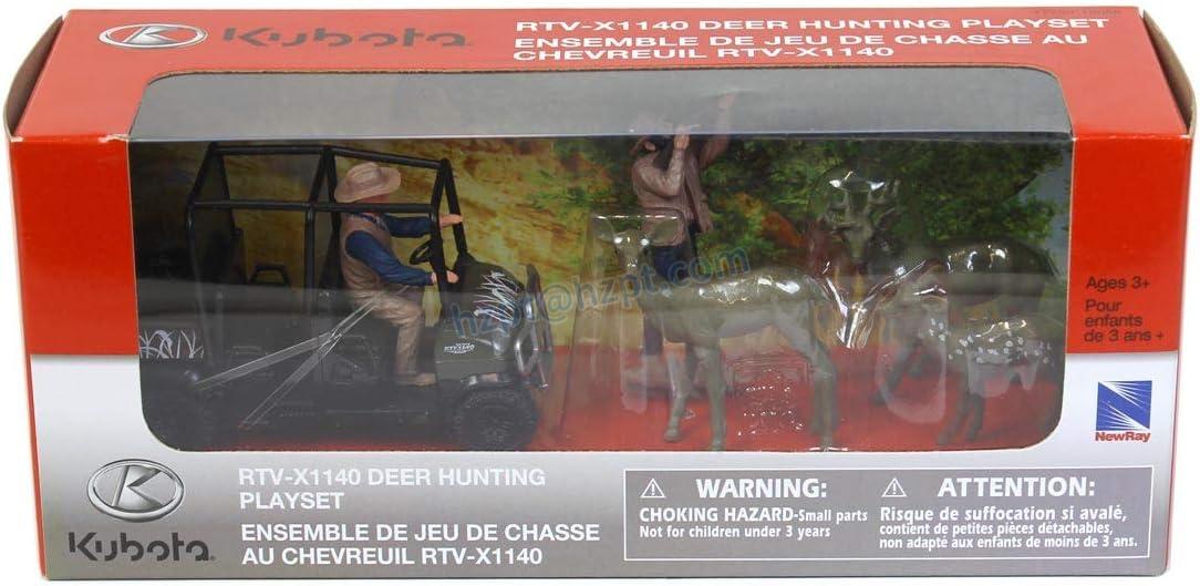 The Kubota Camo RTV Deer Hunting Set by New Ray is a must-have for little hunters or Kubota enthusiasts. The set includes an RTV, two hunting figures, and three deer figures. The RTV measures approximately 3.75"L x 1.75"W x 2.5"H and is made of plastic by New Ray. This set is recommended for ages 3+ years.
