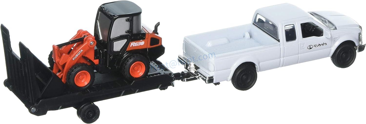 The New-Ray Kubota R630 Wheel Loader with Ford F-250 Pickup & Trailer (Orange, White) is a true-to-scale replica of the real vehicle, with a highly detailed finish. This diecast model is made of top-quality materials to ensure durability and longevity.