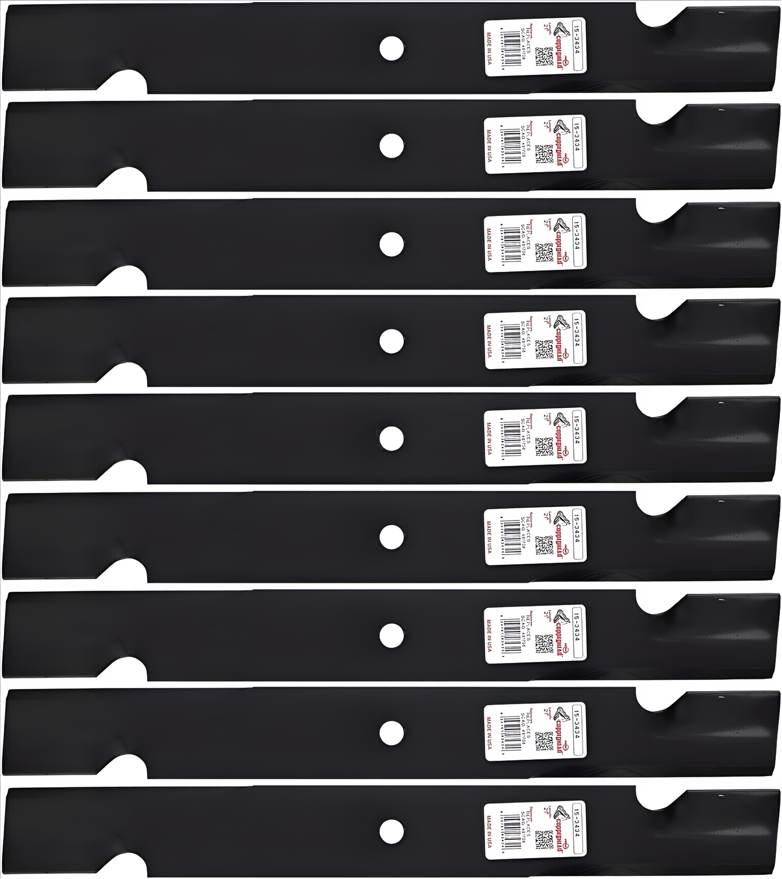 The Rotary 3434 Mower Blades are OEM replacement lawn mower blades that are made in the United States. These blades have a notched design, and they are 21 inches in length, 2-1/2 inches in width, and .204 inches in thickness, with a 5/8” center hole. They are suitable for 61-inch decks and require three blades to operate properly.