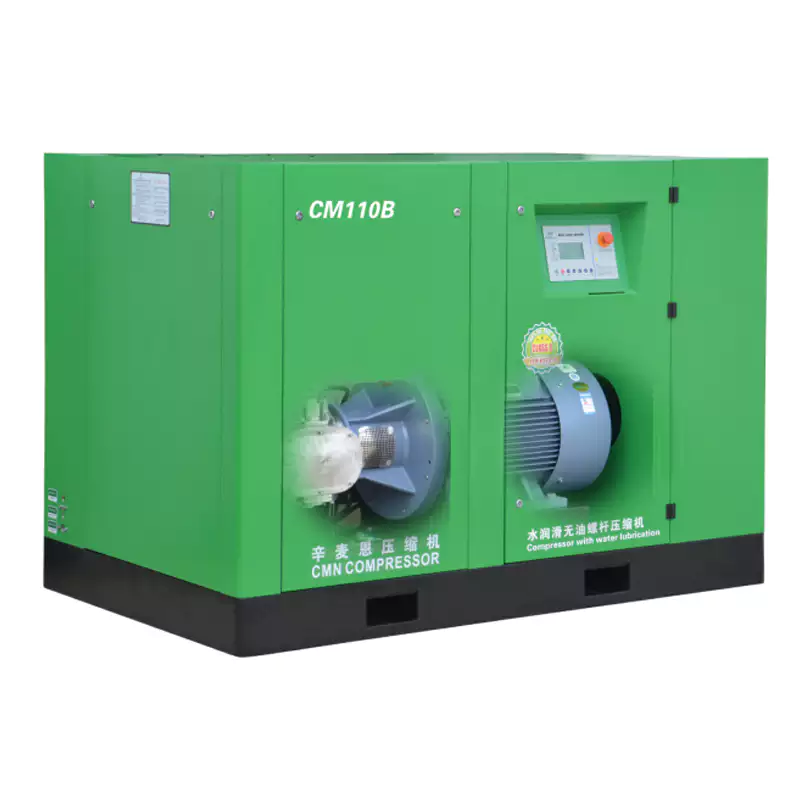The oil-free screw air compressor uses a pair of main screws, the air pressure screw and the rotating screw, to complete the compression process. These screws are usually made of high-strength alloy steel and have precise spiral shapes. During the intake process, the spiral shape of the air pressure screw and rotating screw forms a sealed working chamber between them. As the screws rotate, the working chamber gradually expands, causing external air to enter the working chamber through the intake port. Once the air enters the working chamber, the rotation of the screws causes the working chamber to gradually shrink. This shrinkage gradually increases the compression ratio of the air, thereby increasing the pressure of the air. During this process, the air is compressed and pushed towards the machine's outlet. The compressed air generates heat during the compression process, so a cooling system is needed to reduce the temperature. At the same time, to ensure the quality of the air, the compressed air needs to be cleaned through a filtration system to remove potential pollutants and particles.