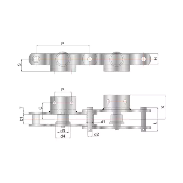 | Pitch | WidthBetweenInnerPlates | BushDiameter | Pin | Plate | Attachment Dimension | UltimateTensileStrength | |||||||