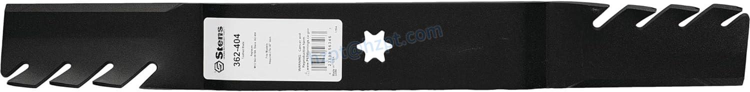 The Stens 362-404 Toothed Blade is compatible with/replacement for Troy-Bilt lawn mowers that require 2 blades for a 42" deck. It has a center hole with a 6 pt. star, a length of 21 1/4", a thickness of 0.187", and a width of 2 1/2". It replaces OEM numbers from various brands, including Bolens, Cub Cadet, MTD, Toro, and Troy-Bilt.