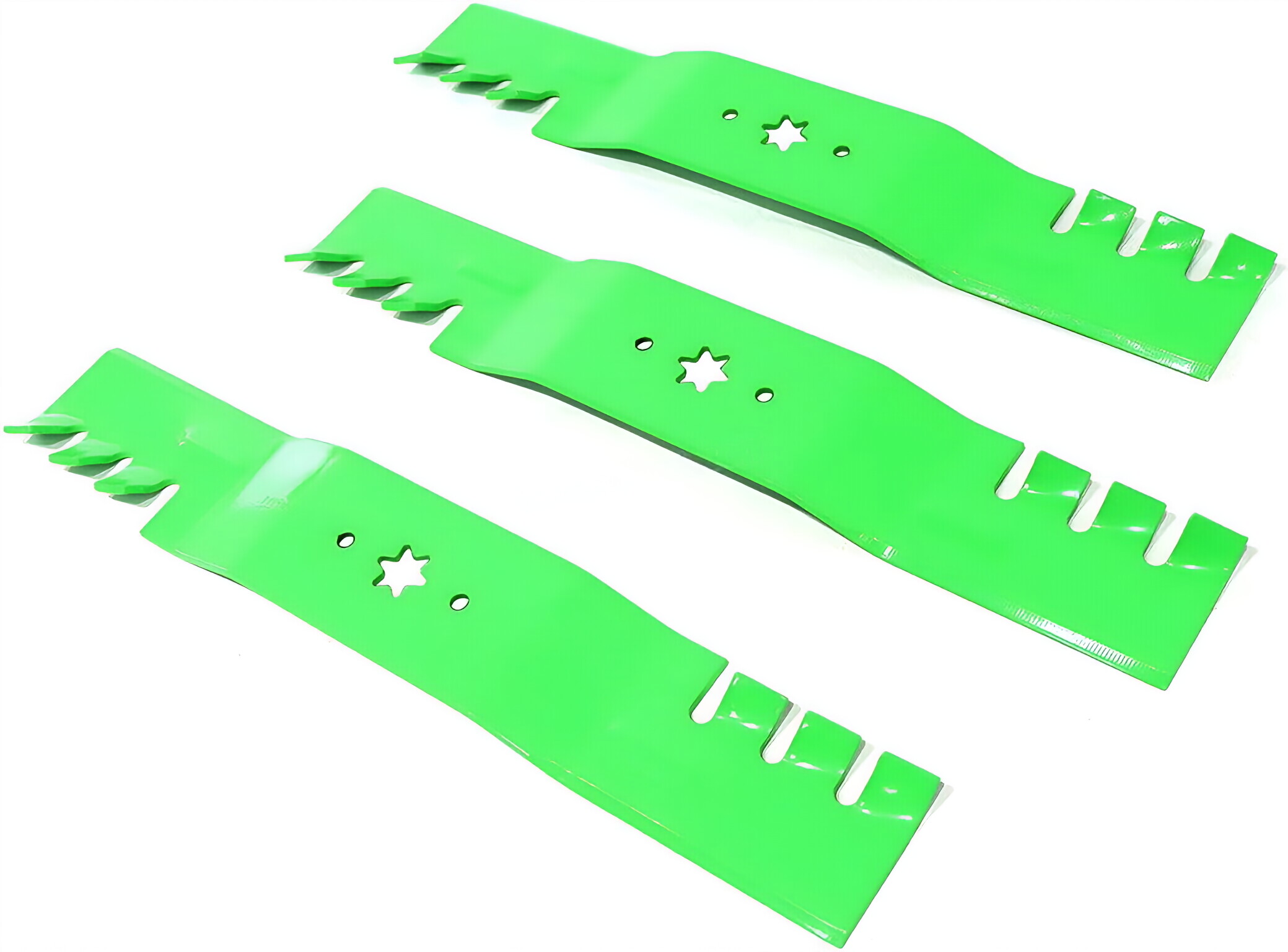 The STILEALUS 3 Pack Mower Blade for MTD Cu-b Ca-det RZT S54 54 inches Deck Toothed Mulching is a replacement blade designed to fit a wide variety of lawn mowers. It is made of high-quality steel and has a painted green finish. The blade is 18 1/2 inches long and 3 inches wide, and has a 6-point star center hole. It is specifically designed for use with gas-powered lawn mowers with a 54-inch deck size.