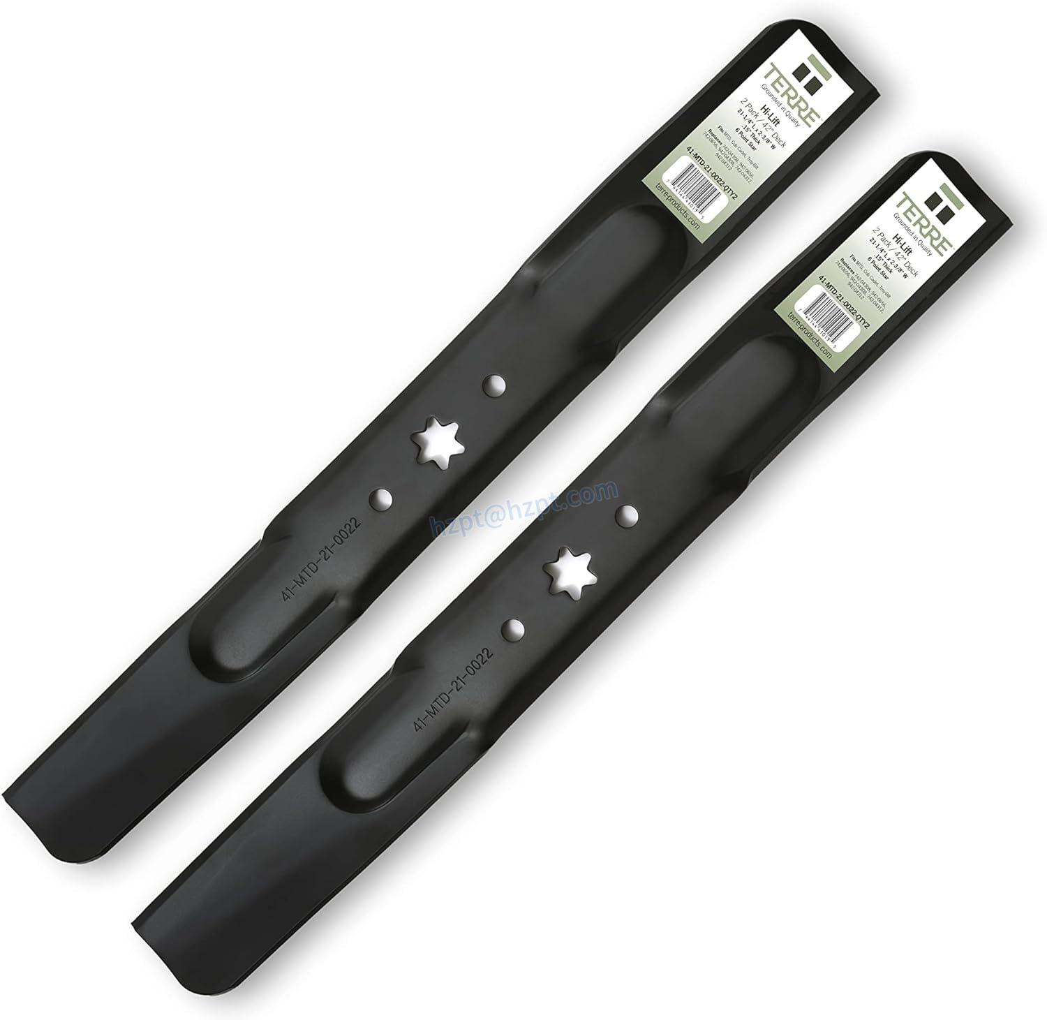 The Terre Products High Lift Lawn Mower Blades are replacement blades for Cub Cadet, Troy Bilt and Craftsman lawn mowers. These blades have a length of 21-1/4", width of 2-3/8" and thickness of .15". They come in a pack of two and have a 6-point star center hole. These blades are compatible with a 42-inch deck and are designed to provide a high lift for efficient grass cutting.
