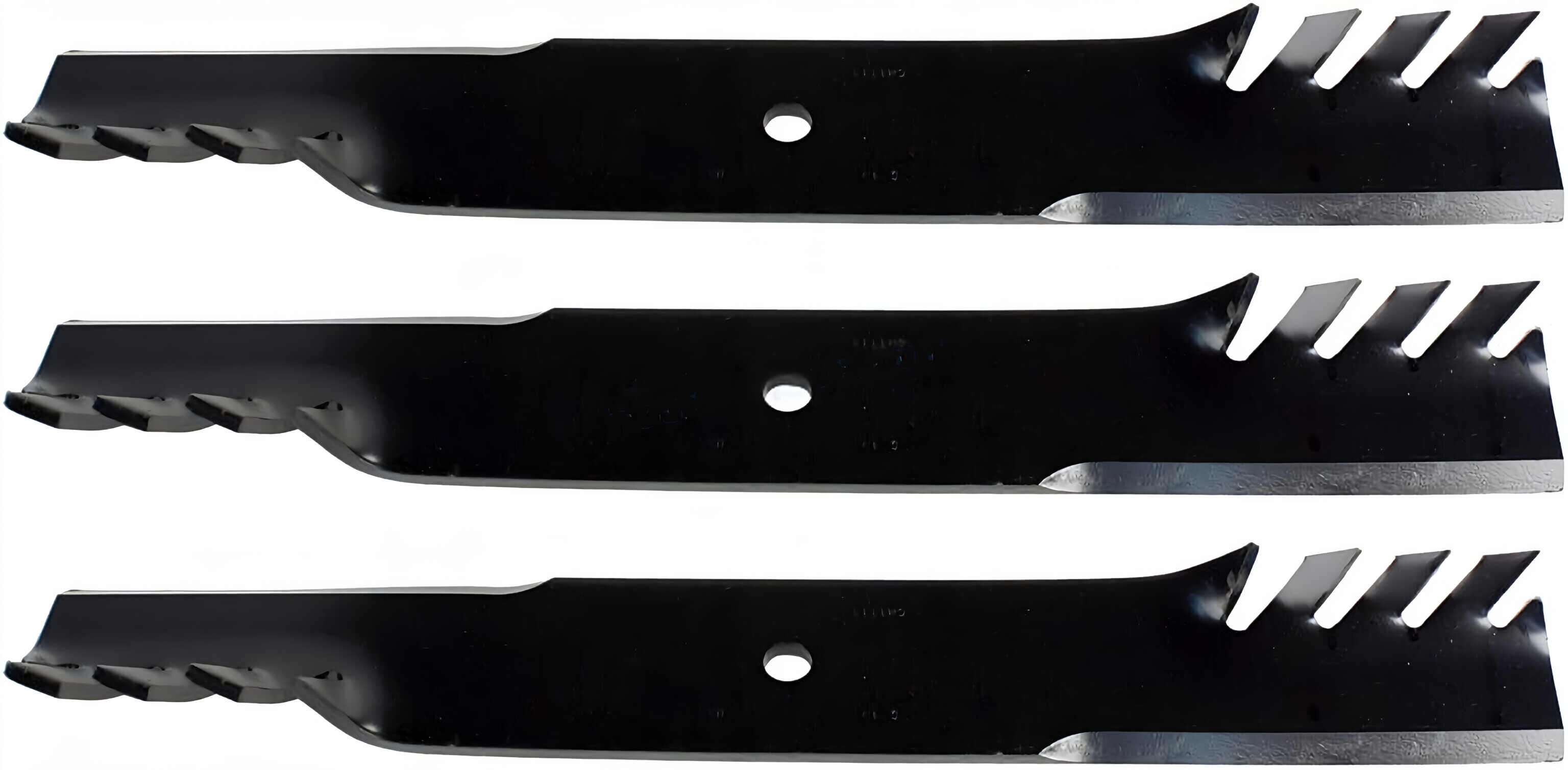 USA Mower Blades® CMB111BP has a blade type of toothed, lift of high lift, length of 21 in., width of 2-1/2 in., thickness of 0.240 in., and center hole of 5/8 in. Three blades are required for 60- and 61-inch decks, and the Rotary® Number is 15007.