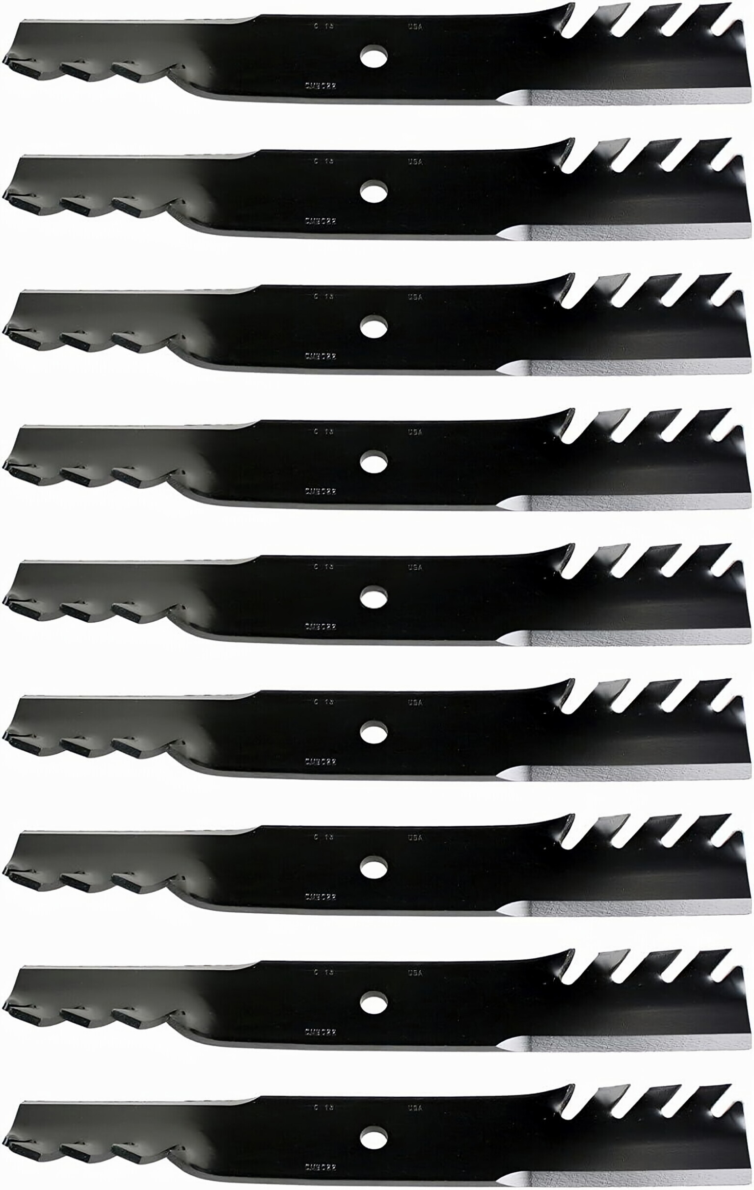 USA Mower Blades® manufactures high-quality, OEM replacement lawn mower blades made in the USA. Our MB022BP blade is a toothed high-lift replacement blade designed to fit various mower brands and models. It is perfect for mowing tall grass and leaves on your lawn. The blade measures 18 inches in length, 2-1/2 inches in width, and 0.203 inches in thickness. It has a center hole of 5/8 inches and fits 36-inch, 52-inch, and 54-inch decks.