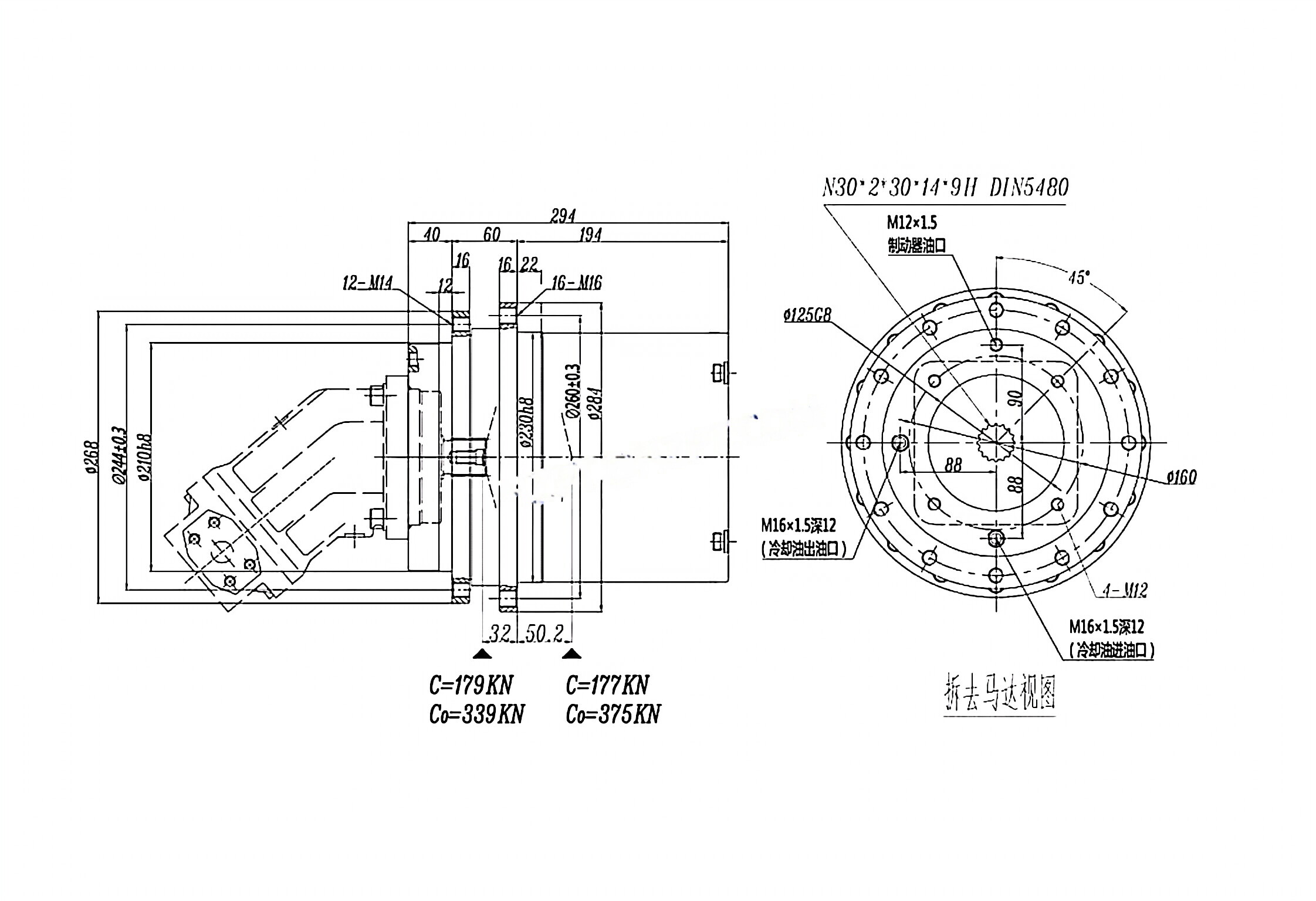 Maximum output torque 10000Nm, reduction ratio 21.6, with built-in parking brake, maximum input speed 3500rpmThis product is used for the crawler drive of the harvester, the machine horsepower is 120 horsepower, and the engine speed is 725-2800rpm.rice harvester wheel drive units