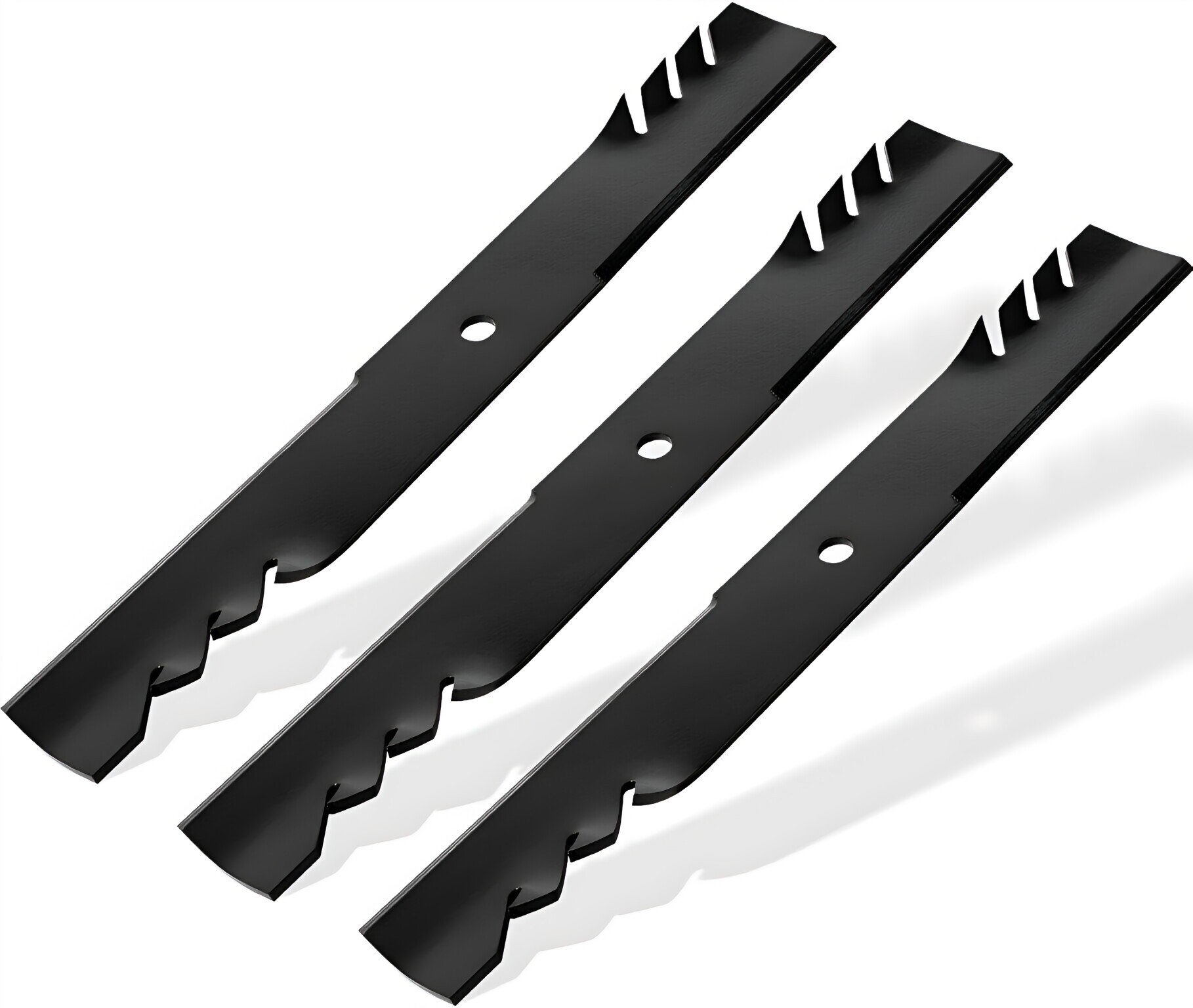 Our replacement blades are designed to provide cleaner, more efficient cutting compared to traditional blades. They are constructed from high-grade steel with a black coating for corrosion resistance. The center hole shape is circular, and the center hole diameter is 5/8". The blade is 20-1/2" in length, 2-1/2" in width, with a thickness of 0.203", and an offset of 0. The air lift is 3/4". These blades are gator blades, which can clear grass clippings from the cutting deck faster, reduce grass clumps and clogging of the mower deck, and provide superior mulching, less bagging, and cleaner side discharge.